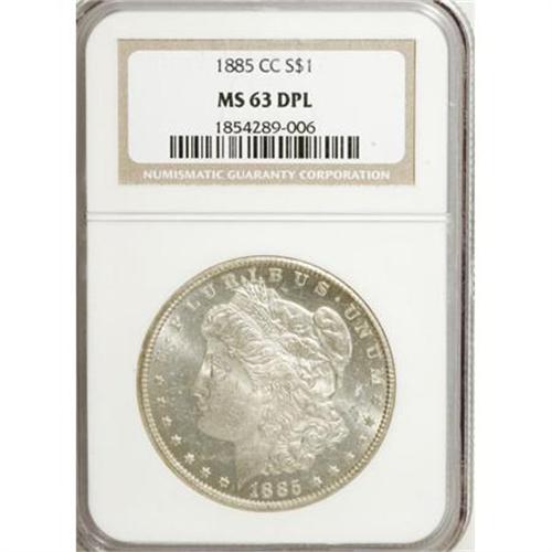 <B>1885-CC $1 MS63 Deep Mirror Prooflike NGC.</B></I> NGC Census: (126/274). PCGS Population (340/672). Numismedia Wsl. Price for NGC/PCGS coin in MS63: $1,050. (#97161)<BR><BR><b>Shipping:</b> Coins & Currency (<a target="_blank" href="http://www.heritageauctions.com/common/shipping.php">view shipping information</a>)