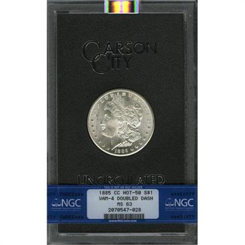 <B>1885-CC $1 Doubled Dash MS63 NGC.</B></I> VAM-4. A Hot 50 Variety. A large chip beneath the second 8 in the date is suggestive of the base of a 7. This lustrous and exactingly struck Carson City GSA Morgan has light to medium gold and apricot reverse toning. Housed in the holder of issue.<BR><BR><B>Coin Engraver:</B> George T. Morgan<BR><BR><b>Shipping:</b> Coins & Currency (<a target="_blank" href="http://www.heritageauctions.com/common/shipping.php">view shipping information</a>)