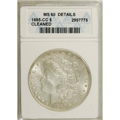 <B>1885-CC $1 --Cleaned--ANACS. MS60 Details.</B></I> NGC Census: (10/6223). PCGS Population (45/14712). Mintage: 228,000. Numismedia Wsl. Price for NGC/PCGS coin in MS60: $515. (#7160)<BR><BR><B>Coin Engraver:</B> George T. Morgan<BR><BR><b>Shipping:</b> Coins & Currency (<a target="_blank" href="http://www.heritageauctions.com/common/shipping.php">view shipping information</a>\)