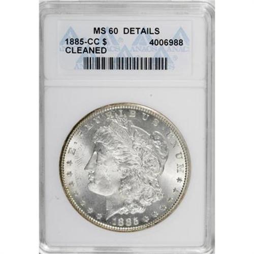 <B>1885-CC $1 --Cleaned--ANACS. MS60 Details.</B></I> NGC Census: (10/6290). PCGS Population (45/14812). Mintage: 228,000. Numismedia Wsl. Price for NGC/PCGS coin in MS60: $515. (#7160)<BR><BR><B>Coin Engraver:</B> George T. Morgan<BR><BR><b>Shipping:</b> Coins & Currency (<a target="_blank" href="http://www.heritageauctions.com/common/shipping.php">view shipping information</a>)