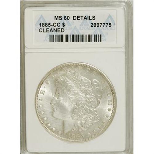 <B>1885-CC $1 --Cleaned--ANACS. MS60 Details.</B></I> NGC Census: (10/6223). PCGS Population (45/14712). Mintage: 228,000. Numismedia Wsl. Price for NGC/PCGS coin in MS60: $515. (#7160)<BR><BR><B>Coin Engraver:</B> George T. Morgan<BR><BR><b>Shipping:</b> Coins & Currency (<a target="_blank" href="http://www.heritageauctions.com/common/shipping.php">view shipping information</a>)