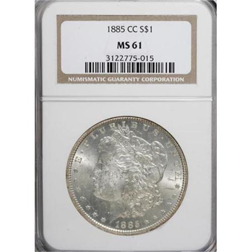 <B>1885-CC $1 MS61 NGC.</B></I> NGC Census: (86/6394). PCGS Population (203/14996). Mintage: 228,000. Numismedia Wsl. Price for NGC/PCGS coin in MS61: $525. (#7160)<BR><BR><B>Coin Engraver:</B> George T. Morgan<BR><BR><b>Shipping:</b> Coins & Currency (<a target="_blank" href="http://www.heritageauctions.com/common/shipping.php">view shipping information</a>)