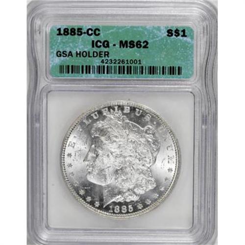<B>1885-CC $1 MS62 ICG.</B></I> Ex: GSA Holder. NGC Census: (392/5818). PCGS Population (1055/13526). Mintage: 228,000. Numismedia Wsl. Price for NGC/PCGS coin in MS62: $535. (#7160)<BR><BR><B>Coin Engraver:</B> George T. Morgan<BR><BR><b>Shipping:</b> Coins & Currency (<a target="_blank" href="http://www.heritageauctions.com/common/shipping.php">view shipping information</a>)