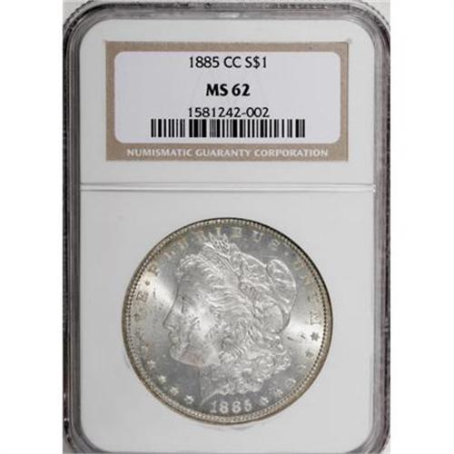 <B>1885-CC $1 MS62 NGC.</B></I> NGC Census: (401/5898). PCGS Population (1073/13693). Mintage: 228,000. Numismedia Wsl. Price for NGC/PCGS coin in MS62: $535. (#7160)<BR><BR><B>Coin Engraver:</B> George T. Morgan<BR><BR><b>Shipping:</b> Coins & Currency (<a target="_blank" href="http://www.heritageauctions.com/common/shipping.php">view shipping information</a>)