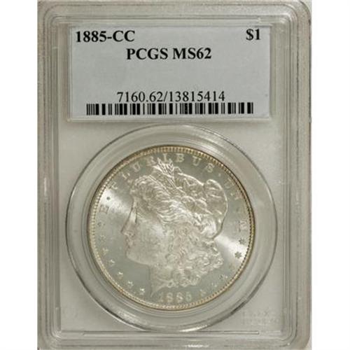 <B>1885-CC $1 MS62 PCGS.</B></I> PCGS Population (1049/13464). NGC Census: (385/5758). Mintage: 228,000. Numismedia Wsl. Price for NGC/PCGS coin in MS62: $535. (#7160)<BR><BR><B>Coin Engraver:</B> George T. Morgan<BR><BR><b>Shipping:</b> Coins & Currency (<a target="_blank" href="http://www.heritageauctions.com/common/shipping.php">view shipping information</a>\)