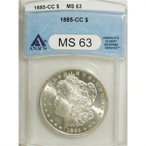 <B>1885-CC $1 MS63 ANACS.</B></I> NGC Census: (1396/4274). PCGS Population (3509/9809). Mintage: 228,000. Numismedia Wsl. Price for NGC/PCGS coin in MS63: $545. (#7160)<BR><BR><b>Shipping:</b> Coins & Currency (<a target="_blank" href="http://www.heritageauctions.com/common/shipping.php">view shipping information</a>)