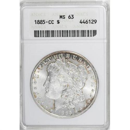 <B>1885-CC $1 MS63 ANACS.</B></I> . NGC Census: (1496/4482). PCGS Population (3594/10236). Mintage: 228,000. Numismedia Wsl. Price for NGC/PCGS coin in MS63: $545. (#7160)<BR><BR><B>Coin Engraver:</B> George T. Morgan<BR><BR><b>Shipping:</b> Coins & Currency (<a target="_blank" href="http://www.heritageauctions.com/common/shipping.php">view shipping information</a>)
