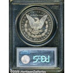 <B>1885-CC<img border='0' src='http://www.heritagecoins.com/images/star.gif' width=10 height=10>$1 MS63 Deep Mirror Prooflike PCGS.</B></I> Splotches of light blue and mauve toning adhere to lustrous surfaces.