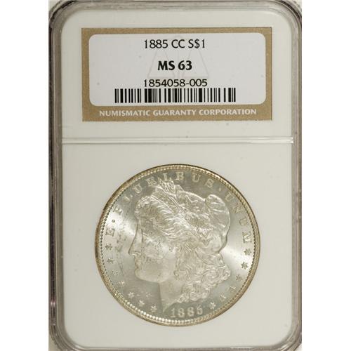 <B>1885-CC $1 MS63 NGC.</B></I> NGC Census: (1368/4210). PCGS Population (3491/9831). Mintage: 228,000. Numismedia Wsl. Price: $545. (#7160)<BR><BR><b>Shipping:</b> Coins & Currency (<a target="_blank" href="http://www.heritageauctions.com/common/shipping.php">view shipping information</a>)