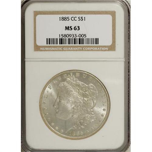 <B>1885-CC $1 MS63 NGC.</B></I> NGC Census: (1422/4336). PCGS Population (3536/9928). Mintage: 228,000. Numismedia Wsl. Price for NGC/PCGS coin in MS63: $545. (#7160)<BR><BR><B>Coin Engraver:</B> George T. Morgan<BR><BR><b>Shipping:</b> Coins & Currency (<a target="_blank" href="http://www.heritageauctions.com/common/shipping.php">view shipping information</a>\)
