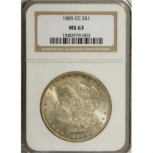 <B>1885-CC $1 MS63 NGC.</B></I> NGC Census: (1431/4353). PCGS Population (3538/9931). Mintage: 228,000. Numismedia Wsl. Price for NGC/PCGS coin in MS63: $545. (#7160)<BR><BR><B>Coin Engraver:</B> George T. Morgan<BR><BR><b>Shipping:</b> Coins & Currency (<a target="_blank" href="http://www.heritageauctions.com/common/shipping.php">view shipping information</a>)