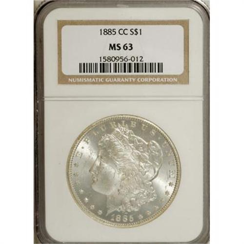 <B>1885-CC $1 MS63 NGC.</B></I> NGC Census: (1431/4353). PCGS Population (3538/9931). Mintage: 228,000. Numismedia Wsl. Price for NGC/PCGS coin in MS63: $545. (#7160)<BR><BR><B>Coin Engraver:</B> George T. Morgan<BR><BR><b>Shipping:</b> Coins & Currency (<a target="_blank" href="http://www.heritageauctions.com/common/shipping.php">view shipping information</a>)