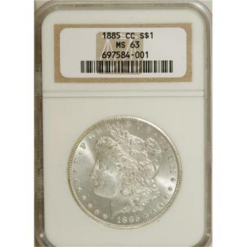 <B>1885-CC $1 MS63 NGC.</B></I> NGC Census: (1431/4353). PCGS Population (3538/9931). Mintage: 228,000. Numismedia Wsl. Price for NGC/PCGS coin in MS63: $545. (#7160)<BR><BR><B>Coin Engraver:</B> George T. Morgan<BR><BR><b>Shipping:</b> Coins & Currency (<a target="_blank" href="http://www.heritageauctions.com/common/shipping.php">view shipping information</a>)