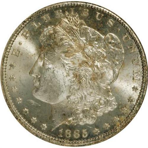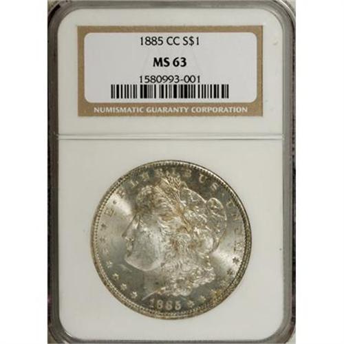 <B>1885-CC $1 MS63 NGC.</B></I> NGC Census: (1431/4353). PCGS Population (3541/9949). Mintage: 228,000. Numismedia Wsl. Price for NGC/PCGS coin in MS63: $545. (#7160)<BR><BR><B>Coin Engraver:</B> George T. Morgan<BR><BR><b>Shipping:</b> Coins & Currency (<a target="_blank" href="http://www.heritageauctions.com/common/shipping.php">view shipping information</a>)