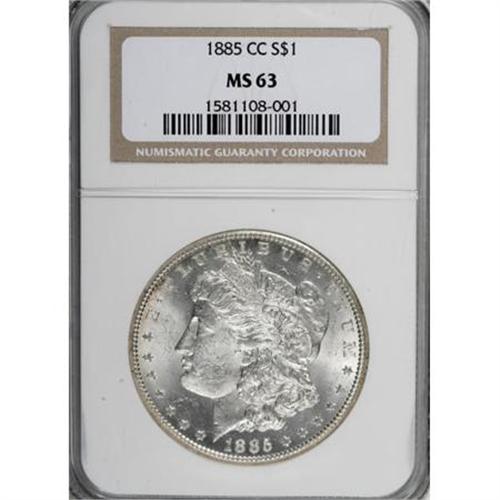 <B>1885-CC $1 MS63 NGC.</B></I> NGC Census: (1438/4380). PCGS Population (3556/10017). Mintage: 228,000. Numismedia Wsl. Price for NGC/PCGS coin in MS63: $545. (#7160)<BR><BR><B>Coin Engraver:</B> George T. Morgan<BR><BR><b>Shipping:</b> Coins & Currency (<a target="_blank" href="http://www.heritageauctions.com/common/shipping.php">view shipping information</a>)