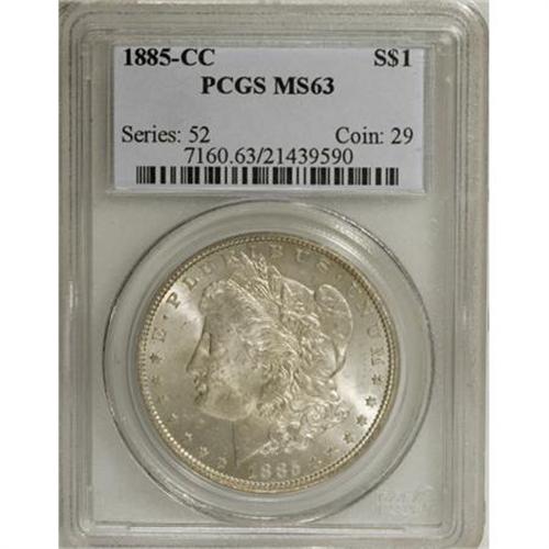<B>1885-CC $1 MS63 PCGS.</B></I> PCGS Population (3549/9988). NGC Census: (1438/4380). Mintage: 228,000. Numismedia Wsl. Price for NGC/PCGS coin in MS63: $545. (#7160)<BR><BR><B>Coin Engraver:</B> George T. Morgan<BR><BR><b>Shipping:</b> Coins & Currency (<a target="_blank" href="http://www.heritageauctions.com/common/shipping.php">view shipping information</a>)