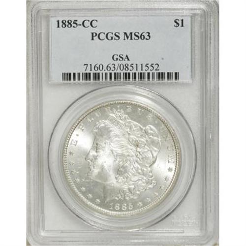 <B>1885-CC $1 MS63 PCGS.</B></I> Ex: GSA. PCGS Population (3561/10033). NGC Census: (1438/4380). Mintage: 228,000. Numismedia Wsl. Price for NGC/PCGS coin in MS63: $545. (#7160)<BR><BR><B>Coin Engraver:</B> George T. Morgan<BR><BR><b>Shipping:</b> Coins & Currency (<a target="_blank" href="http://www.heritageauctions.com/common/shipping.php">view shipping information</a>)