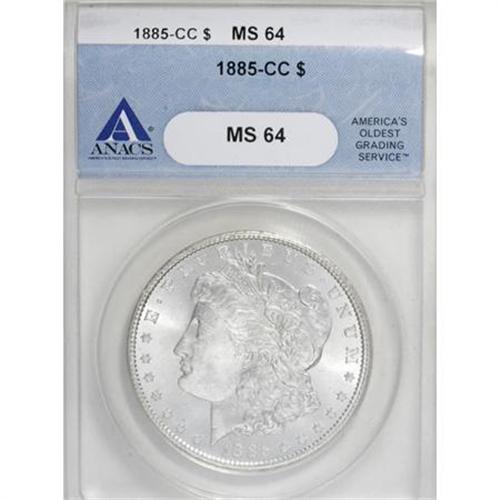 <B>1885-CC $1 MS64 ANACS.</B></I> . NGC Census: (2550/1921). PCGS Population (5995/4241). Mintage: 228,000. Numismedia Wsl. Price for NGC/PCGS coin in MS64: $575. (#7160)<BR><BR><B>Coin Engraver:</B> George T. Morgan<BR><BR><b>Shipping:</b> Coins & Currency (<a target="_blank" href="http://www.heritageauctions.com/common/shipping.php">view shipping information</a>)