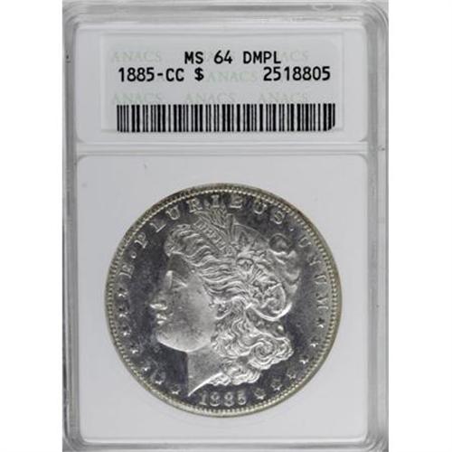 <B>1885-CC $1 MS64 Deep Mirror Prooflike ANACS.</B></I> The near-brilliant surfaces display just a whisper of dappled gold patina around the rims. The motifs stand out against deeply mirrored fields, especially when the coin is tilted beneath a light source, adding to its eye appeal. The design features are generally well struck, except for weakness in the hair overlying Liberty's ear. Minor luster grazes on Liberty's cheek and neck and in the left (facing) obverse field limit the grade.<BR><BR><b>Shipping:</b> Coins & Currency (<a target="_blank" href="http://www.heritageauctions.com/common/shipping.php">view shipping information</a>)