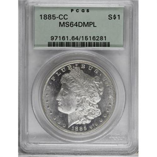 <B>1885-CC $1 MS64 Deep Mirror Prooflike PCGS.</B></I> An increasingly popular CC-mint issue, here with deeply contrasting surfaces and a decent strike, despite the light roller marks appearing on the chin. Certified in a green-label holder.<BR><BR><b>Shipping:</b> Coins & Currency (<a target="_blank" href="http://www.heritageauctions.com/common/shipping.php">view shipping information</a>)