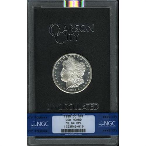 <B>1885-CC $1 MS64 Deep Mirror Prooflike NGC.</B></I> This brilliant Carson City dollar has ice-white devices and impressive field reflectivity. Smooth overall, with occasional minor marks on the left obverse field. NGC GSA Census: 15 in 64 Deep Mirror Prooflike, 6 finer (1/08).<BR><BR><b>Shipping:</b> Coins & Currency (<a target="_blank" href="http://www.heritageauctions.com/common/shipping.php">view shipping information</a>)