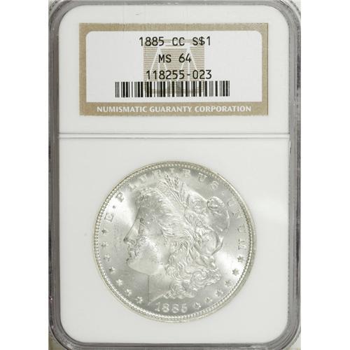 <B>1885-CC $1 MS64 NGC.</B></I> NGC Census: (2398/1812). PCGS Population (5771/4060). Mintage: 228,000. Numismedia Wsl. Price: $575. (#7160)<BR><BR><b>Shipping:</b> Coins & Currency (<a target="_blank" href="http://www.heritageauctions.com/common/shipping.php">view shipping information</a>)