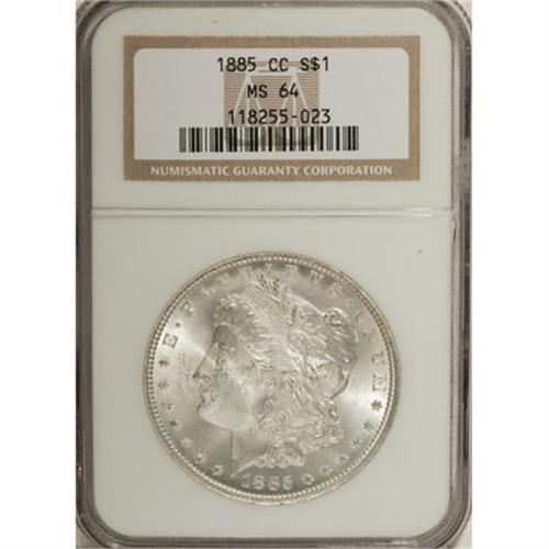 <B>1885-CC $1 MS64 NGC.</B></I> NGC Census: (2398/1812). PCGS Population (5771/4060). Mintage: 228,000. Numismedia Wsl. Price: $575. (#7160)<BR><BR><b>Shipping:</b> Coins & Currency (<a target="_blank" href="http://www.heritageauctions.com/common/shipping.php">view shipping information</a>)