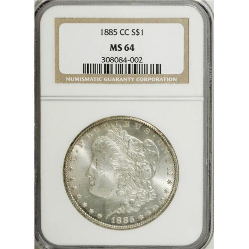 <B>1885-CC $1 MS64 NGC.</B></I> NGC Census: (2400/1815). PCGS Population (5771/4060). Mintage: 228,000. Numismedia Wsl. Price: $575. (#7160)<BR><BR><b>Shipping:</b> Coins & Currency (<a target="_blank" href="http://www.heritageauctions.com/common/shipping.php">view shipping information</a>)