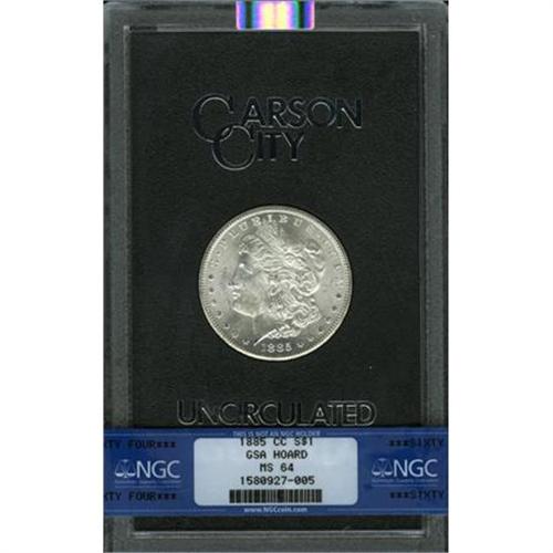 <B>1885-CC $1 MS64 NGC.</B></I> NGC Census: (2449/1879). PCGS Population (5839/4085). Mintage: 228,000. Numismedia Wsl. Price for NGC/PCGS coin in MS64: $575. (#7160)<BR><BR><B>Coin Engraver:</B> George T. Morgan<BR><BR><b>Shipping:</b> Coins & Currency (<a target="_blank" href="http://www.heritageauctions.com/common/shipping.php">view shipping information</a>\)