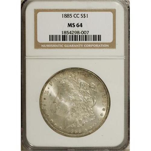 <B>1885-CC $1 MS64 NGC.</B></I> NGC Census: (2451/1885). PCGS Population (5846/4082). Mintage: 228,000. Numismedia Wsl. Price for NGC/PCGS coin in MS64: $575. (#7160)<BR><BR><B>Coin Engraver:</B> George T. Morgan<BR><BR><b>Shipping:</b> Coins & Currency (<a target="_blank" href="http://www.heritageauctions.com/common/shipping.php">view shipping information</a>)