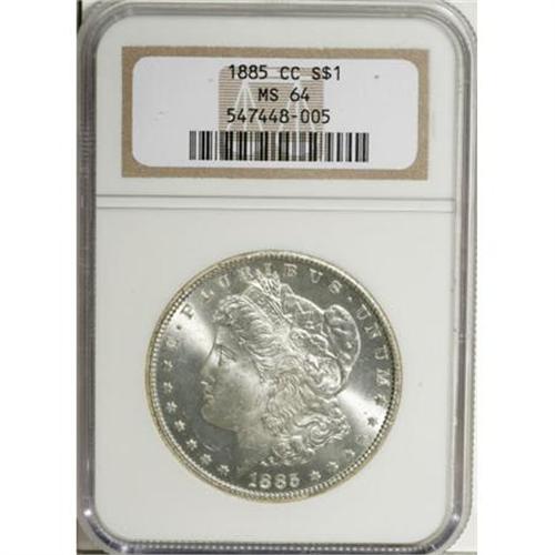 <B>1885-CC $1 MS64 NGC.</B></I> NGC Census: (2481/1899). PCGS Population (5909/4145). Mintage: 228,000. Numismedia Wsl. Price for NGC/PCGS coin in MS64: $575. (#7160)<BR><BR><B>Coin Engraver:</B> George T. Morgan<BR><BR><b>Shipping:</b> Coins & Currency (<a target="_blank" href="http://www.heritageauctions.com/common/shipping.php">view shipping information</a>)