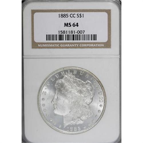 <B>1885-CC $1 MS64 NGC.</B></I> NGC Census: (2481/1899). PCGS Population (5924/4164). Mintage: 228,000. Numismedia Wsl. Price for NGC/PCGS coin in MS64: $575. (#7160)<BR><BR><B>Coin Engraver:</B> George T. Morgan<BR><BR><b>Shipping:</b> Coins & Currency (<a target="_blank" href="http://www.heritageauctions.com/common/shipping.php">view shipping information</a>)