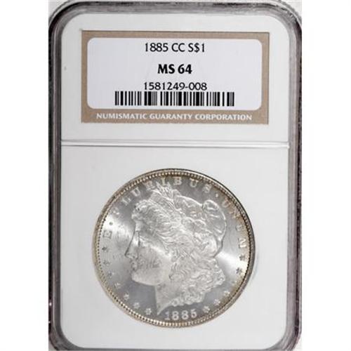 <B>1885-CC $1 MS64 NGC.</B></I> NGC Census: (2523/1892). PCGS Population (5951/4190). Mintage: 228,000. Numismedia Wsl. Price for NGC/PCGS coin in MS64: $575. (#7160)<BR><BR><B>Coin Engraver:</B> George T. Morgan<BR><BR><b>Shipping:</b> Coins & Currency (<a target="_blank" href="http://www.heritageauctions.com/common/shipping.php">view shipping information</a>)