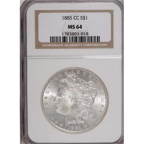 <B>1885-CC $1 MS64 NGC.</B></I> NGC Census: (2558/1923). PCGS Population (6026/4279). Mintage: 228,000. Numismedia Wsl. Price for NGC/PCGS coin in MS64: $580. (#7160)<BR><BR><B>Coin Engraver:</B> George T. Morgan<BR><BR><b>Shipping:</b> Coins & Currency (<a target="_blank" href="http://www.heritageauctions.com/common/shipping.php">view shipping information</a>)