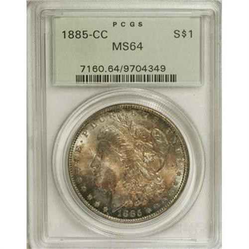 <B>1885-CC $1 MS64 PCGS.</B></I> PCGS Population (5777/4032). NGC Census: (2433/1859). Mintage: 228,000. Numismedia Wsl. Price for NGC/PCGS coin in MS64: $575. (#7160)<BR><BR><b>Shipping:</b> Coins & Currency (<a target="_blank" href="http://www.heritageauctions.com/common/shipping.php">view shipping information</a>)