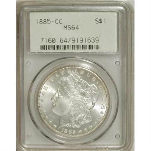 <B>1885-CC $1 MS64 PCGS.</B></I> PCGS Population (5888/4129). NGC Census: (2481/1899). Mintage: 228,000. Numismedia Wsl. Price for NGC/PCGS coin in MS64: $575. (#7160)<BR><BR><B>Coin Engraver:</B> George T. Morgan<BR><BR><b>Shipping:</b> Coins & Currency (<a target="_blank" href="http://www.heritageauctions.com/common/shipping.php">view shipping information</a>)