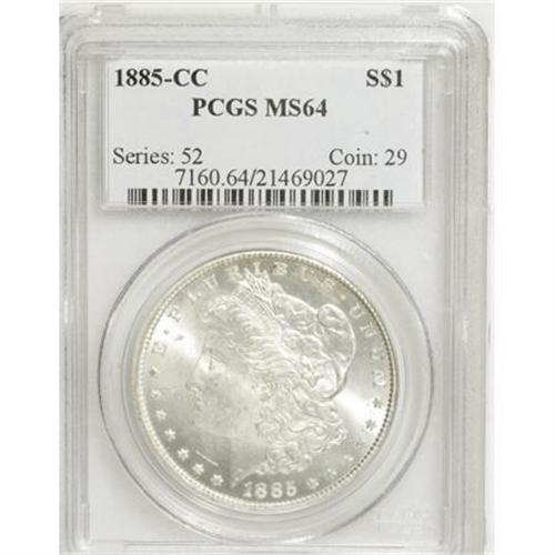 <B>1885-CC $1 MS64 PCGS.</B></I> PCGS Population (5914/4148). NGC Census: (2481/1899). Mintage: 228,000. Numismedia Wsl. Price for NGC/PCGS coin in MS64: $575. (#7160)<BR><BR><B>Coin Engraver:</B> George T. Morgan<BR><BR><b>Shipping:</b> Coins & Currency (<a target="_blank" href="http://www.heritageauctions.com/common/shipping.php">view shipping information</a>)