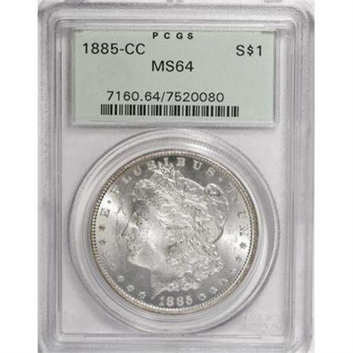 <B>1885-CC $1 MS64 PCGS.</B></I> PCGS Population (5969/4199). NGC Census: (2539/1899). Mintage: 228,000. Numismedia Wsl. Price for NGC/PCGS coin in MS64: $575. (#7160)<BR><BR><B>Coin Engraver:</B> George T. Morgan<BR><BR><b>Shipping:</b> Coins & Currency (<a target="_blank" href="http://www.heritageauctions.com/common/shipping.php">view shipping information</a>)