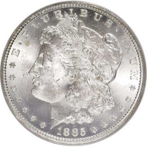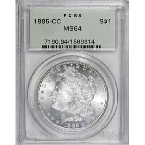 <B>1885-CC $1 MS64 PCGS.</B></I> PCGS Population (5972/4217). NGC Census: (2539/1899). Mintage: 228,000. Numismedia Wsl. Price for NGC/PCGS coin in MS64: $575. (#7160)<BR><BR><B>Coin Engraver:</B> George T. Morgan<BR><BR><b>Shipping:</b> Coins & Currency (<a target="_blank" href="http://www.heritageauctions.com/common/shipping.php">view shipping information</a>)