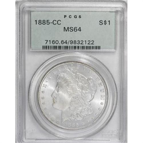 <B>1885-CC $1 MS64 PCGS.</B></I> . PCGS Population (5995/4241). NGC Census: (2554/1928). Mintage: 228,000. Numismedia Wsl. Price for NGC/PCGS coin in MS64: $580. (#7160)<BR><BR><B>Coin Engraver:</B> George T. Morgan<BR><BR><b>Shipping:</b> Coins & Currency (<a target="_blank" href="http://www.heritageauctions.com/common/shipping.php">view shipping information</a>)