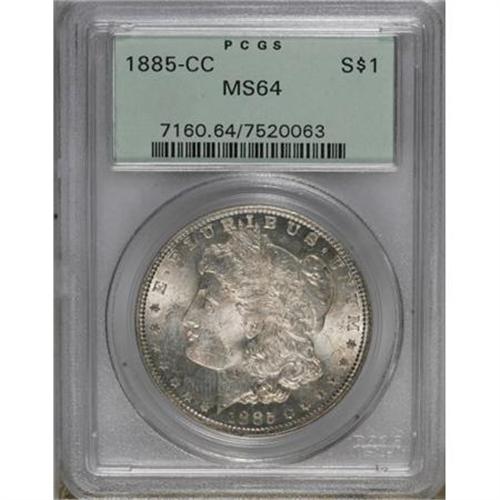 <B>1885-CC $1 MS64 PCGS.</B></I> PCGS Population (6031/4283). NGC Census: (2562/1914). Mintage: 228,000. Numismedia Wsl. Price for NGC/PCGS coin in MS64: $580. (#7160)<BR><BR><B>Coin Engraver:</B> George T. Morgan<BR><BR><b>Shipping:</b> Coins & Currency (<a target="_blank" href="http://www.heritageauctions.com/common/shipping.php">view shipping information</a>)