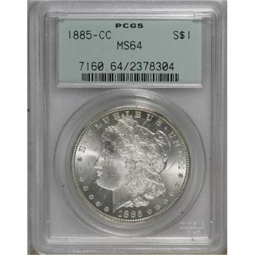 <B>1885-CC $1 MS64 PCGS.</B></I> PCGS Population (6040/4286). NGC Census: (2565/1923). Mintage: 228,000. Numismedia Wsl. Price for NGC/PCGS coin in MS64: $580. (#7160)<BR><BR><B>Coin Engraver:</B> George T. Morgan<BR><BR><b>Shipping:</b> Coins & Currency (<a target="_blank" href="http://www.heritageauctions.com/common/shipping.php">view shipping information</a>)
