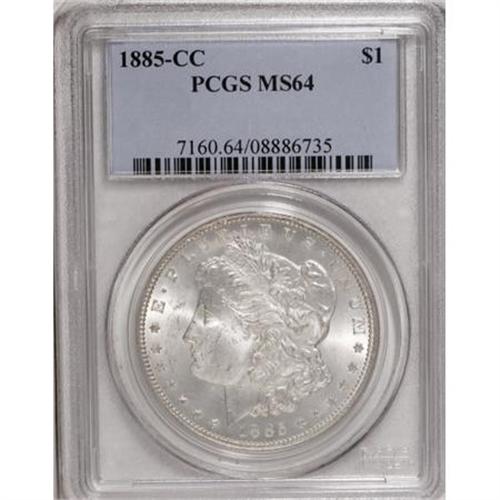 <B>1885-CC $1 MS64 PCGS.</B></I> PCGS Population (6026/4279). NGC Census: (2558/1923). Mintage: 228,000. Numismedia Wsl. Price for NGC/PCGS coin in MS64: $580. (#7160)<BR><BR><B>Coin Engraver:</B> George T. Morgan<BR><BR><b>Shipping:</b> Coins & Currency (<a target="_blank" href="http://www.heritageauctions.com/common/shipping.php">view shipping information</a>)