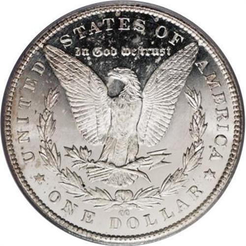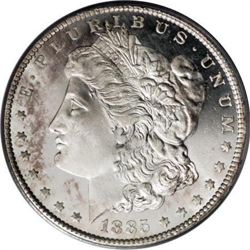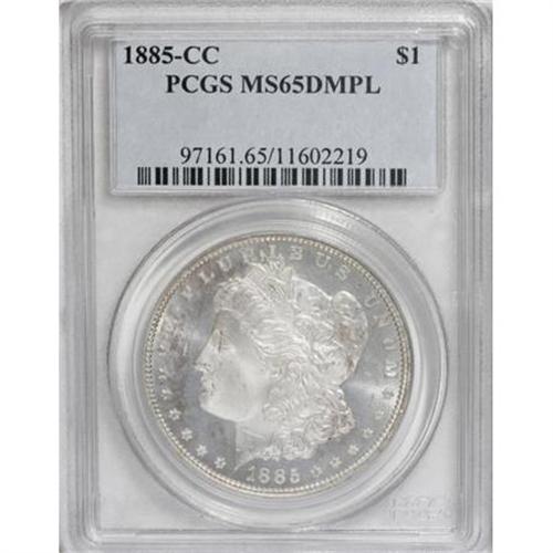<B>1885-CC $1 MS65 Deep Mirror Prooflike PCGS.</B></I> David Bowers (2005) writes that: "The 1885-CC exists by the hundreds of thousands of pieces, as more than half of the original mintage (228,000 pieces) survived and was distributed in the late 20th century." The surviving specimen in this lot is a gorgeous Gem with deep mirror fields that establish outstanding contrast with frosted, sharply struck design elements. Essentially untoned, except for a few speckles of milky-tan color scattered about. There are no significant contact marks to report.<BR><BR><b>Shipping:</b> Coins & Currency (<a target="_blank" href="http://www.heritageauctions.com/common/shipping.php">view shipping information</a>)