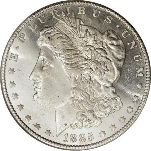 <B>1885-CC $1 MS65 Deep Mirror Prooflike PCGS.</B></I> Despite the low 228,000-piece mintage, the 1885-CC dollar is readily available through Mint State. Deep Mirror Prooflike coins are another story, however. The Gem offered here displays deeply mirrored fields that offset the frosted, well defined motifs. A few minor luster grazes do not disturb.<BR><BR><b>Shipping:</b> Coins & Currency (<a target="_blank" href="http://www.heritageauctions.com/common/shipping.php">view shipping information</a>)