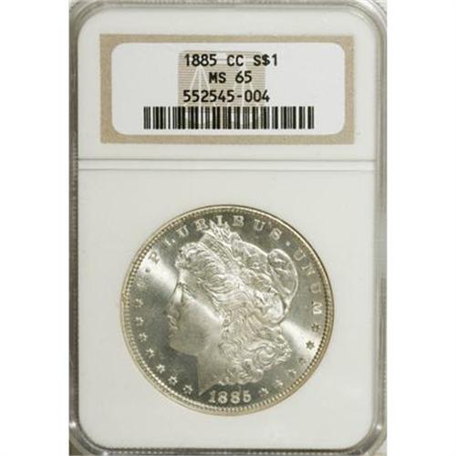 <B>1885-CC $1 MS65 NGC.</B></I> A lovely, high grade coin that has swirling mint luster that is contrasted against flashy, semi-prooflike fields. Sharply struck. The obverse is brilliant while the reverse displays an accent of pale golden patina.<BR><BR><b>Shipping:</b> Coins & Currency (<a target="_blank" href="http://www.heritageauctions.com/common/shipping.php">view shipping information</a>)