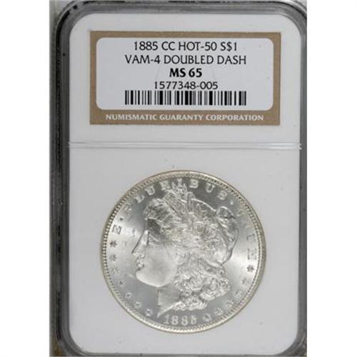 <B>1885-CC $1 MS65 NGC.</B></I> VAM-4. A Hot 50 Variety. Perhaps the most prominent of the 'dash' VAMs of any date, even those from 1880 which are (presumably) 8 over 7 overdates. This nicely struck Carson City dollar has coruscating luster, and is well preserved save for a slender mark northeast of the arrowheads.<BR><BR><B>Coin Engraver:</B> George T. Morgan<BR><BR><b>Shipping:</b> Coins & Currency (<a target="_blank" href="http://www.heritageauctions.com/common/shipping.php">view shipping information</a>)