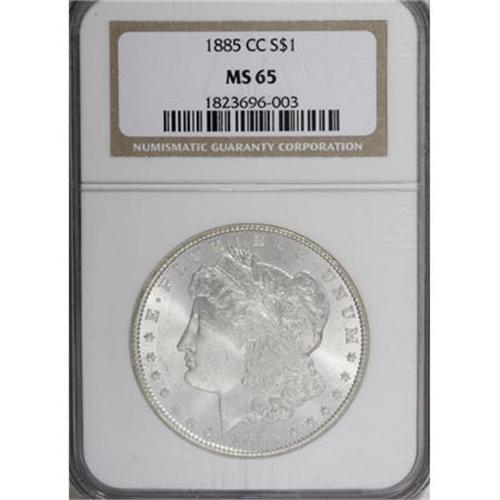 <B>1885-CC $1 MS65 NGC.</B></I> A lightly toned and highly lustrous Gem that has a sharp strike and smooth fields. Even the portrait has only faint grazes. The obverse has a barely visible fingerprint at 4 o'clock.<BR><BR><B>Coin Engraver:</B> George T. Morgan<BR><BR><b>Shipping:</b> Coins & Currency (<a target="_blank" href="http://www.heritageauctions.com/common/shipping.php">view shipping information</a>)