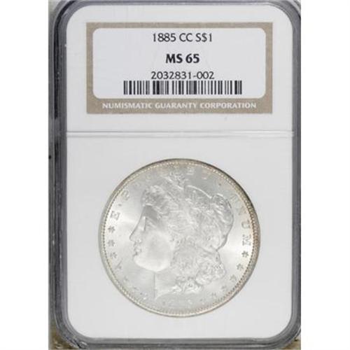 <B>1885-CC $1 MS65 NGC.</B></I> NGC Census: (1459/435). PCGS Population (3347/849). Mintage: 228,000. Numismedia Wsl. Price for NGC/PCGS coin in MS65: $1,025. (#7160)<BR><BR><B>Coin Engraver:</B> George T. Morgan<BR><BR><b>Shipping:</b> Coins & Currency (<a target="_blank" href="http://www.heritageauctions.com/common/shipping.php">view shipping information</a>)