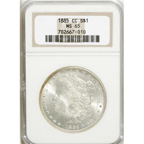 <B>1885-CC $1 MS65 NGC.</B></I> NGC Census: (1460/439). PCGS Population (3350/849). Mintage: 228,000. Numismedia Wsl. Price for NGC/PCGS coin in MS65: $975. (#7160)<BR><BR><B>Coin Engraver:</B> George T. Morgan<BR><BR><b>Shipping:</b> Coins & Currency (<a target="_blank" href="http://www.heritageauctions.com/common/shipping.php">view shipping information</a>)